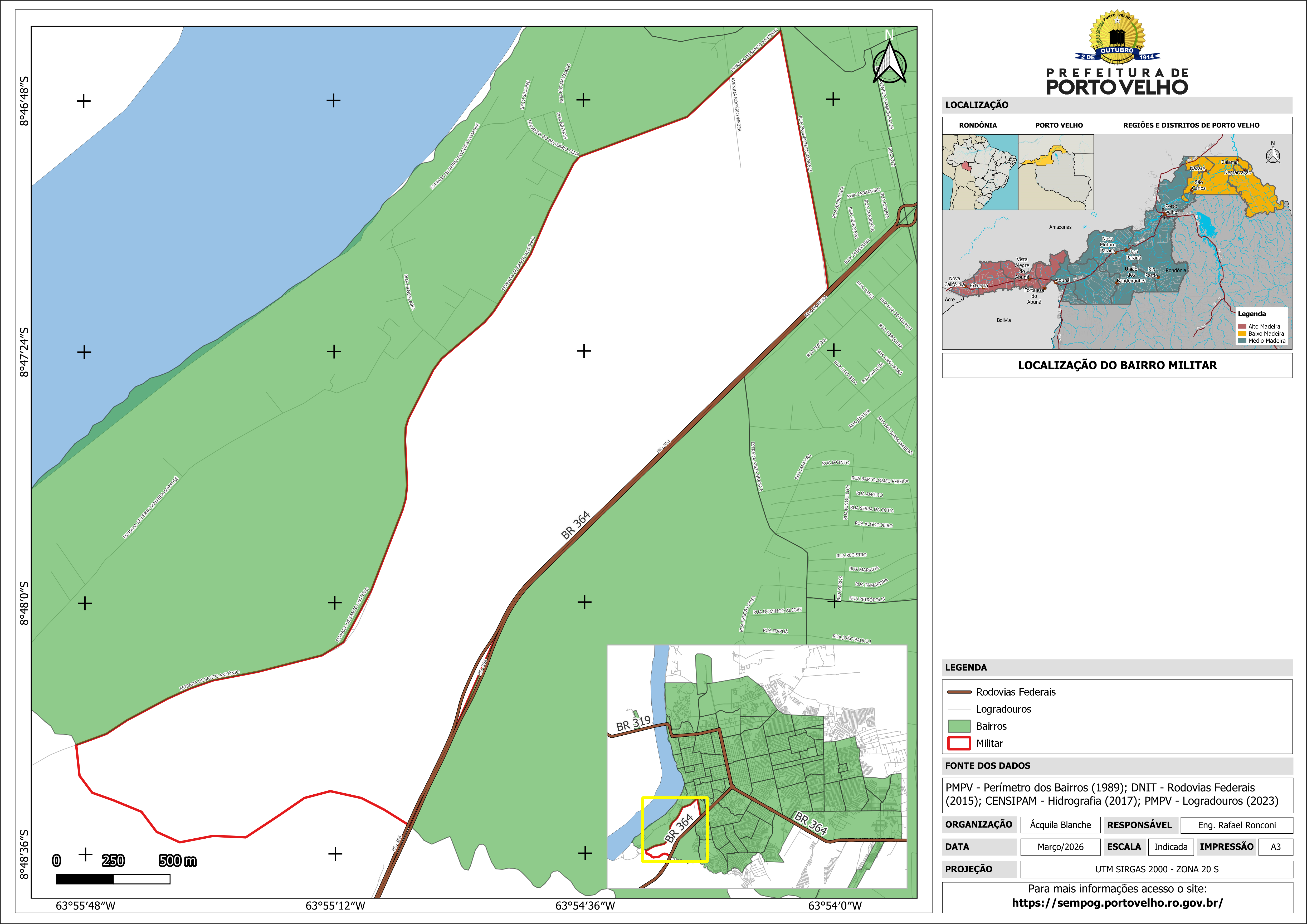 O bairro Militar limita-se pela BR-364 e pelos bairros Areal,